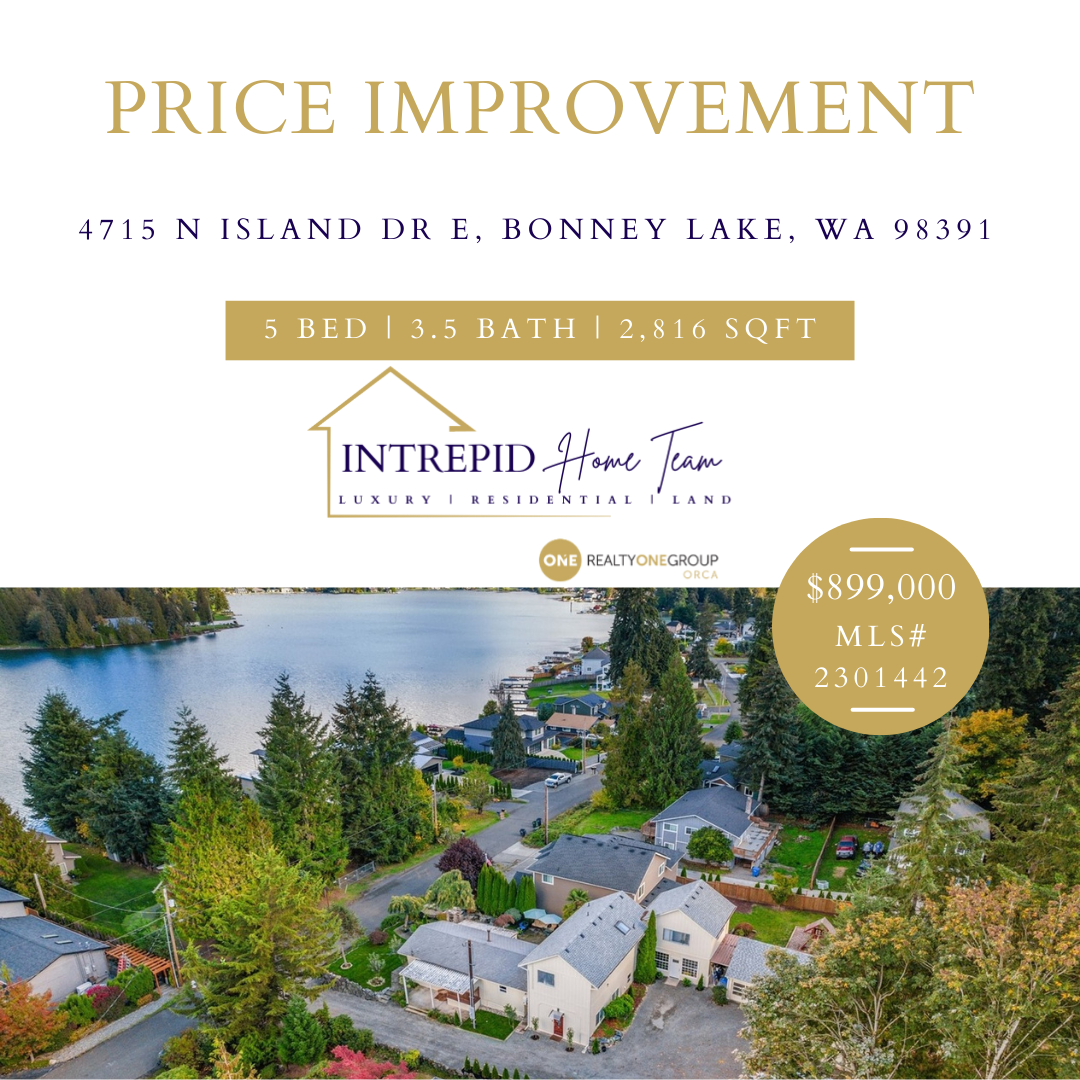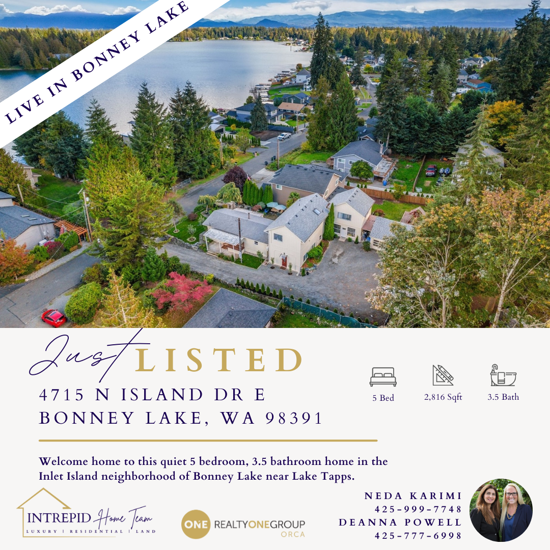 Flyer advertising a property for sale at 4715 N Island Drive E in Bonney Lake, Washington. Features include 5 bedrooms, 3.5 bathrooms, and 2,816 square feet. The house is priced at $899,000 with MLS number 2301442. The flyer includes the logo of the Intrpid Home Team and Realty One Group Orca. The background shows an aerial view of houses near a lake with trees and water.