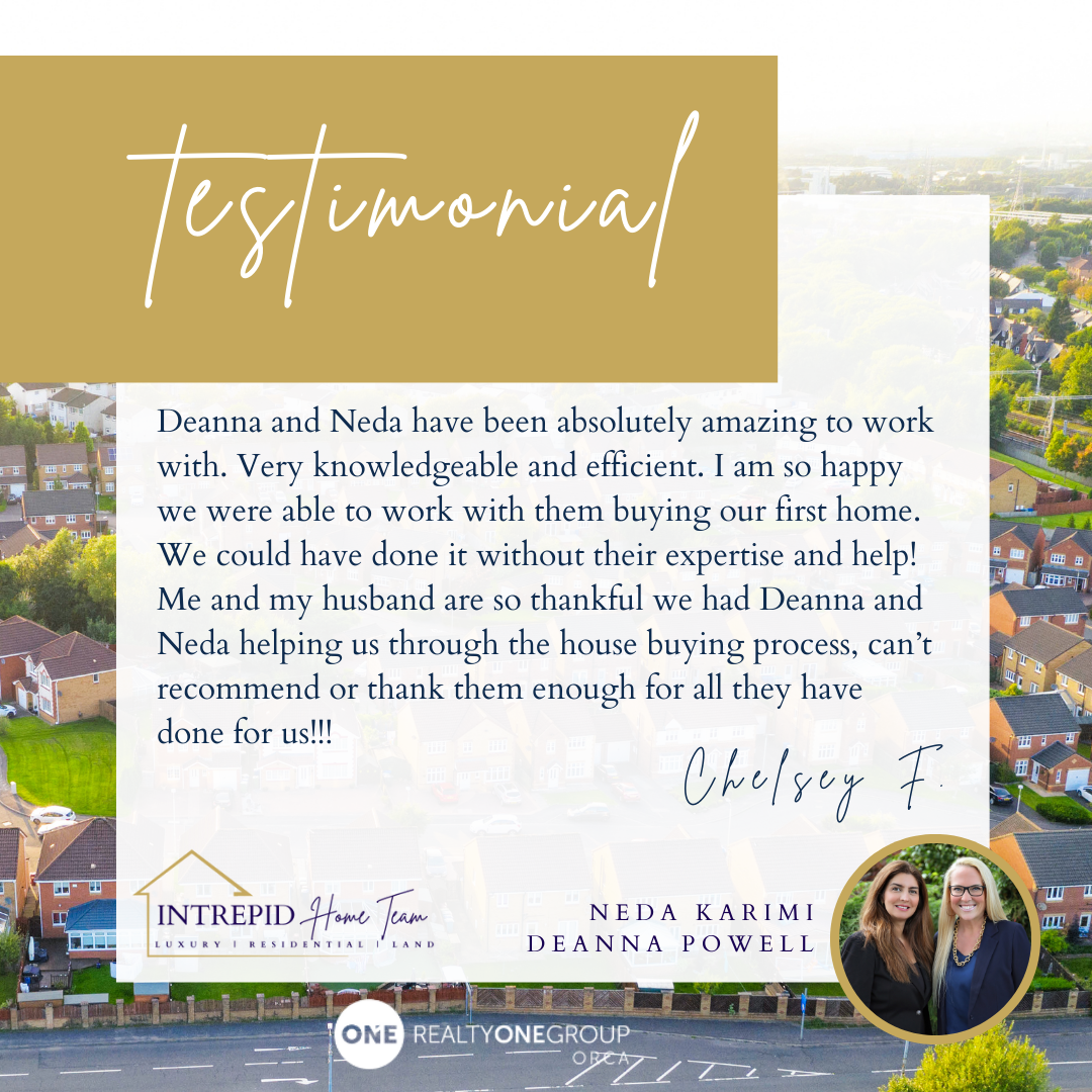 Testimonial from a client praising Deanna and Neda for their expertise in helping buy a first home, signed by Chelsea F. with photos of two women, logos of Intrepid Home Team and Realty One Group.